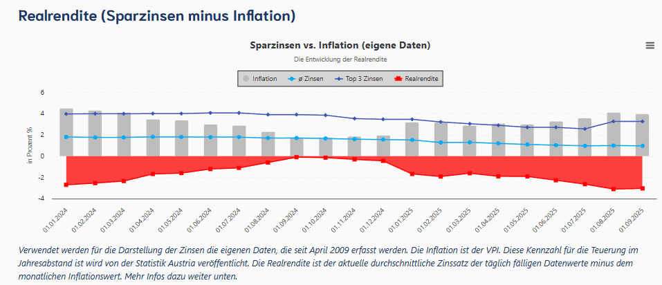 Für Sparerinnen und Sparer, die Wert auf Sicherheit legen und Vermögen kurzfristig verfügbar haben wollen, sind Sparbücher bzw. Sparkonten nach wie vor eine sinnvolle Option. Sie bieten Liquidität, geringe Risikoexposition und einfache Handhabung. Allerdings gilt: Wenn die Inflation bei etwa 4 % liegt (beispielsweise in Österreich), und der Spitzenzins vor Steuer bei rund 2 % liegt, dann ergibt sich eine negative Realrendite. Das heißt: Der Wert des Geldes sinkt in Kaufkraft – trotz nominaler Zinsen.
