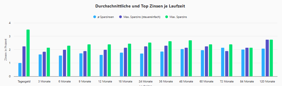 Damit liegen steuereinfache Angebote aktuell im Bereich zwischen 2,10 % und 2,50 % p.a., abhängig von Laufzeit und Bindung. Tagesgeld wird fast ausschließlich noch im Rahmen zeitlich begrenzter Neukundenaktionen angeboten.