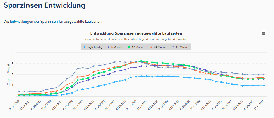 Die Entwicklung der Sparzinsen zeigt deutlich den Zinsanstieg ab Mitte 2022, als die Europäische Zentralbank begann, die Leitzinsen anzuheben. Bis Anfang 2024 erreichten die Sparzinsen ihr Hoch: je nach Laufzeit zwischen 2,5 und 3,2 Prozent. Seither ist ein leichter Rückgang zu beobachten, der sich 2025 auf einem stabilen Niveau um 2 Prozent eingependelt hat. Besonders stark gesunken sind die Zinsen für täglich fällige Anlagen, während mittlere Laufzeiten von 12 bis 24 Monaten noch vergleichsweise attraktive Konditionen bieten.