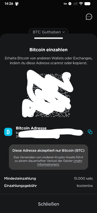 - Adressgenerierung: In der App wird eine individuelle Bitcoin-Empfangsadresse für den Nutzer erstellt.