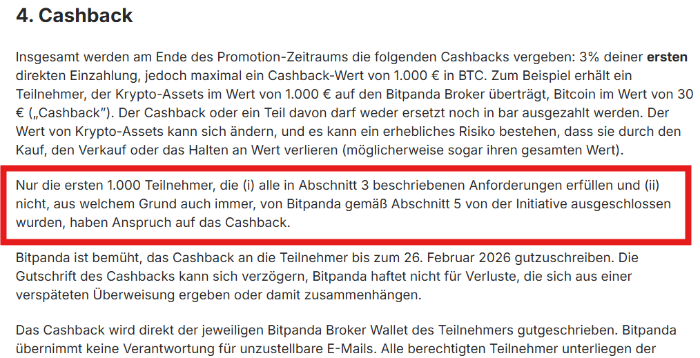 Bitpanda nennt den 26. Februar 2026 als angestrebten Termin für die Cashback-Gutschrift. Gleichzeitig wird klargestellt, dass sich die Auszahlung verzögern kann und keine Haftung für Verluste übernommen wird, die aus einer verspäteten Gutschrift entstehen. Auch hier besteht somit keine feste Zusage, sondern lediglich eine unverbindliche Zielangabe.