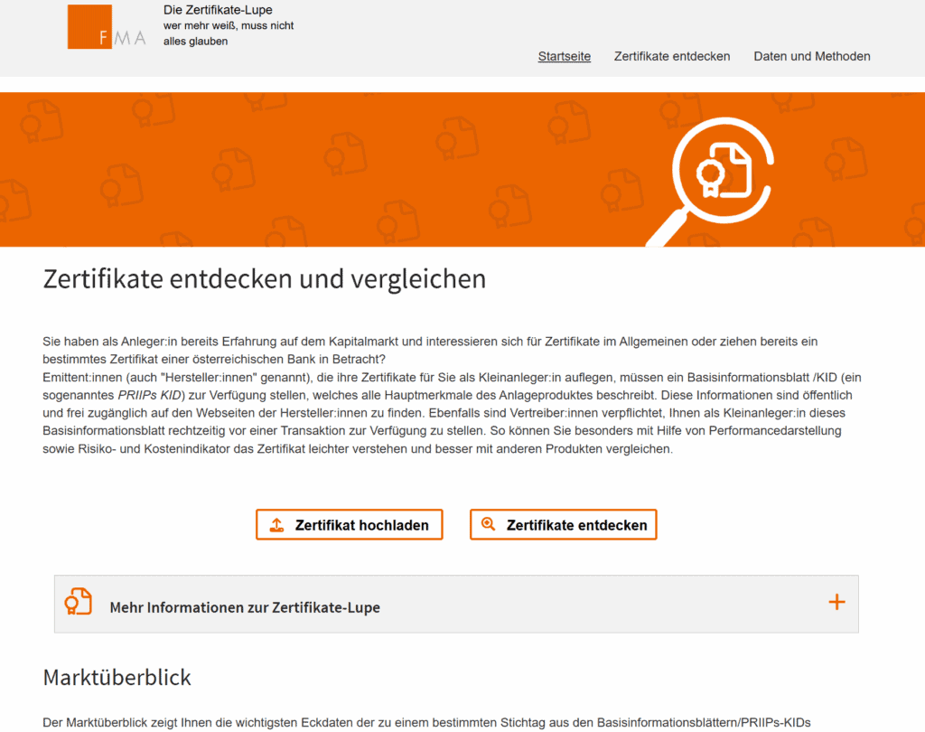 Die österreichische Aufsicht FMA setzt auf Transparenz durch Information und Vergleichstools. Bereits seit 2023 steht die „Zertifikate-Lupe“ online zur Verfügung. Die Zertifikate Lupe ist eine Plattform, die Kleinanlegerinnen und Kleinanlegern erlaubt, Risiko, Kosten und Performance einzelner Zertifikate zu bewerten und mit dem Gesamtmarkt zu vergleichen. Dafür kann das Basisinformationsblatt (PRIIPs-KID) eines Produkts hochgeladen werden.