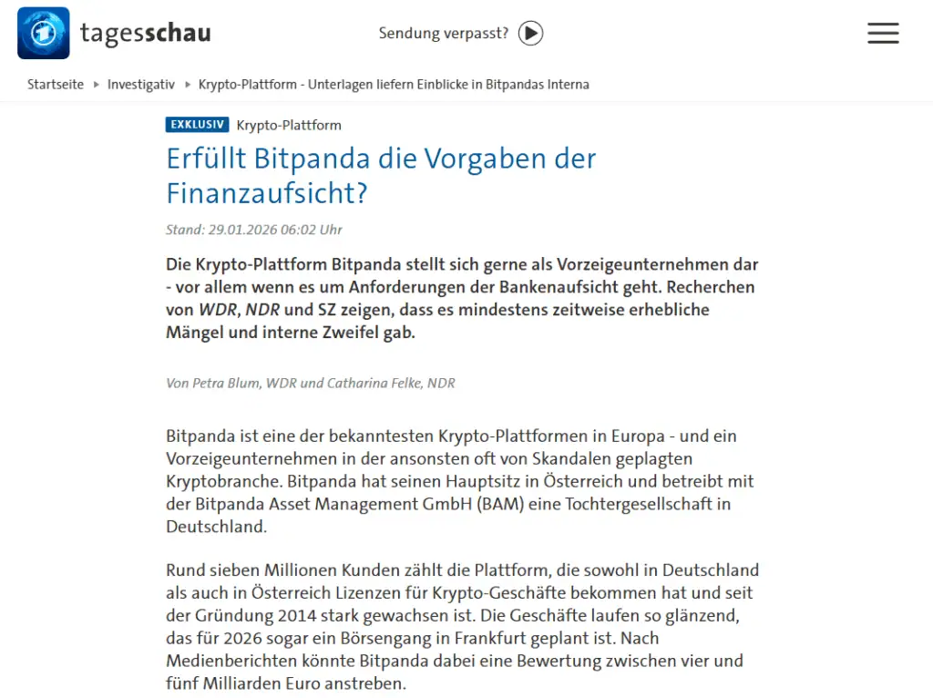 Am heutigen Tag, 29. Jänner 2026, möchte Bitpanda mit dem Handel von echten Aktien und ETFs starten. Zeitgleich sorgen Recherchen von WDR, NDR und Süddeutscher Zeitung für Aufmerksamkeit wie die deutsche Website Tagesschau.de berichtet. Damit rückt das neue Angebot von Bitpanda in den Hintergrund und das Scheinwerferlicht ist auf die regulatorische Vergangenheit des Unternehmens gelegt. Die Berichterstattung lässt wissen, dass interne Unterlagen die Frage aufwerfen, ob Bitpanda die Anforderungen der Finanzaufsicht in allen Phasen erfüllt hat.