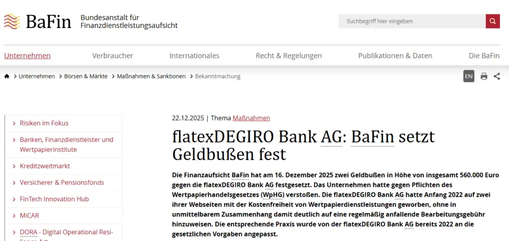 Die Bundesanstalt für Finanzdienstleistungsaufsicht hat am 16. Dezember 2025 zwei Geldbußen in Höhe von insgesamt 560.000 Euro gegen die flatexDEGIRO Bank AG festgesetzt. Hintergrund sind Verstöße gegen Pflichten des Wertpapierhandelsgesetzes, insbesondere gegen die Vorgaben zur klaren und redlichen Information von Kundinnen und Kunden. Details über die Hintergründe nennt die BaFin leider nicht, es bezieht sich jedoch auf ein Vergehen aus dem Jahr 2022, also fast schon 4 Jahre aus.