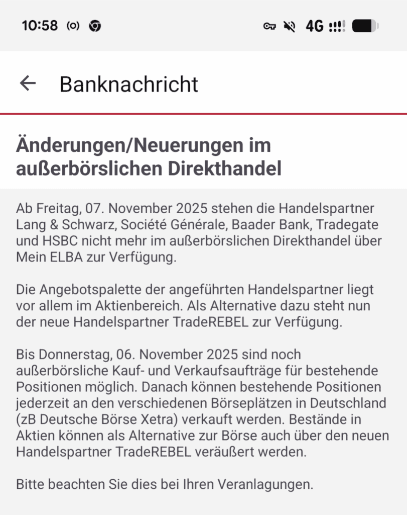 Diese Anbieter stehen ab diesem Datum nicht mehr über Mein ELBA für den außerbörslichen Handel zur Verfügung. Ihre Angebote betrafen vor allem den Aktienhandel.