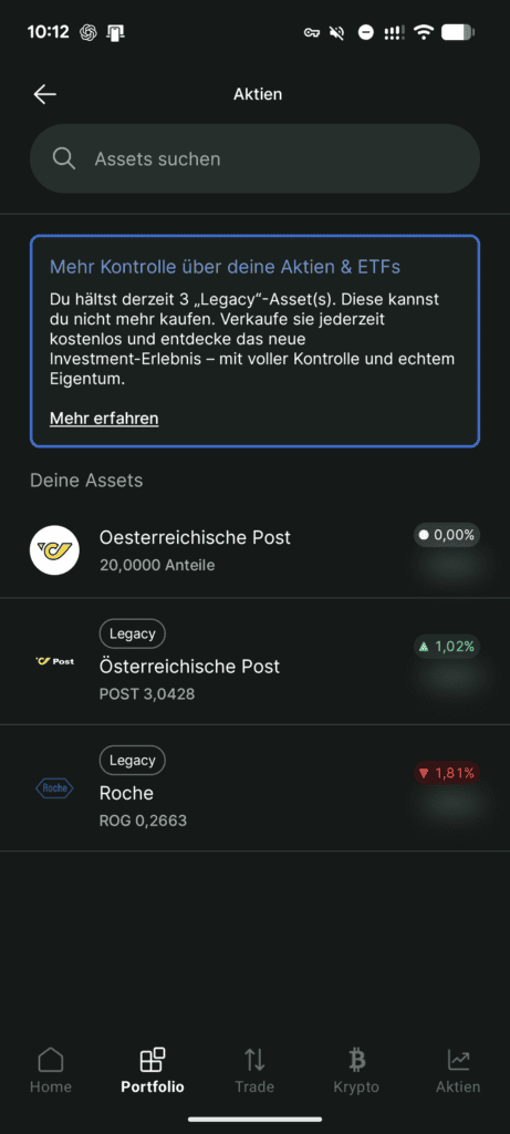 Legacy Assets sind im Portfolio klar mit dem Hinweis „Legacy“ gekennzeichnet, um sie von Real Securities zu unterscheiden. Eine sofortige Handlung ist nicht erforderlich. Wer seine Positionen jedoch reduziert oder schließt, sollte beachten, dass ein Verkauf oder Swap je nach persönlicher steuerlicher Situation steuerliche Konsequenzen haben kann.