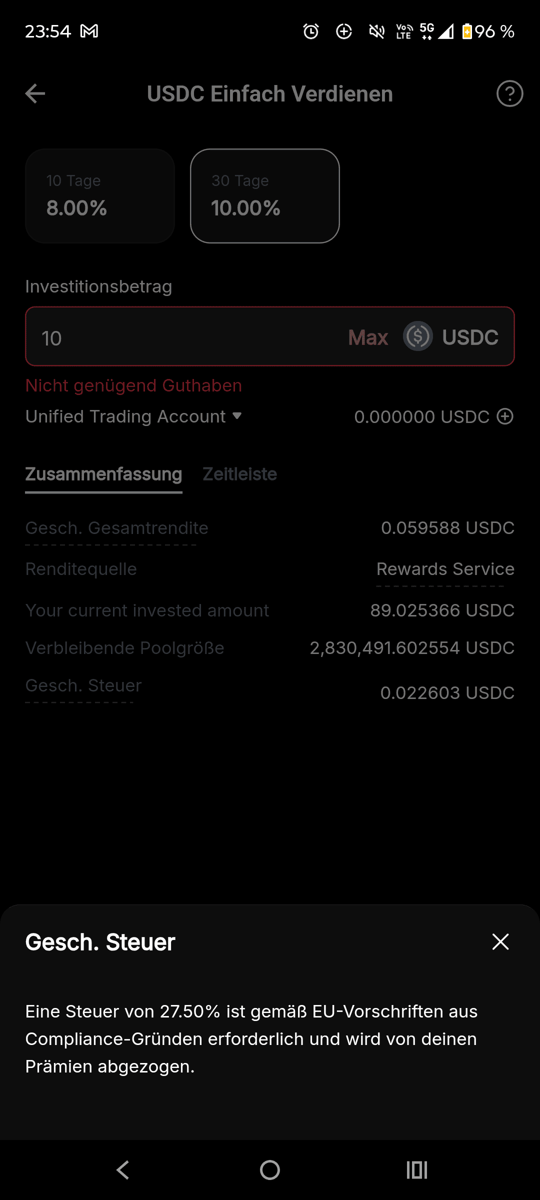 bybit.eu „earn“ scheint aber nun grundsätzlich bereits frei geschaltet zu sein! zumindest kommen dazu spezifische Hinweise siehe zB. nächster Screenshot ( Angabe des vorab geschätzten, voraussichtlich zu erwartenden Betrags bei KeSt von 27,5% …) ps: es wird schon bei Zufluss der rewards besteuert/abgezogen.. ich nehme an weil es kein echtes staking im ursprünglichen Sinne ist, siehe Definition auf der bmv.gv Seite zb.. ich meine, bei bitpanda und krypto assets wie ETH ist es dort definitiv nicht so, kein wöchentlicher KeSt Abzug bei reward Auszahlungen, das ist dort „richtiges“ staking, hier bei bybit womöglich eben nicht.. bei usdc sowieso nicht, aber… Weiterlesen »