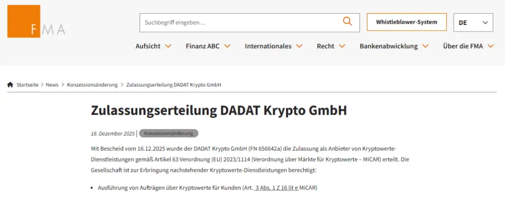 Screenshot Quelle: https://www.fma.gv.at/zulassungserteilung-dadat-krypto-gmbh/