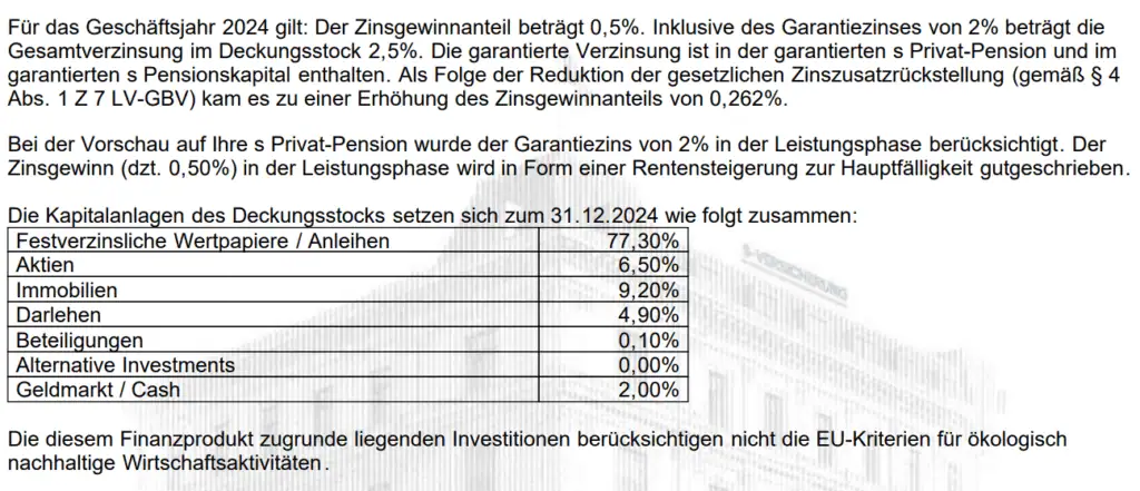 Hier ein Beispiel einer Zukunftsvorsorge die vor über 20 Jahren abgeschlossen wurde. Der Garantiezins, vor Kosten, liegt bei lediglich 2,00 % p.a. und die Kapitalanlagen selbst sind sehr konservativ gewählt: