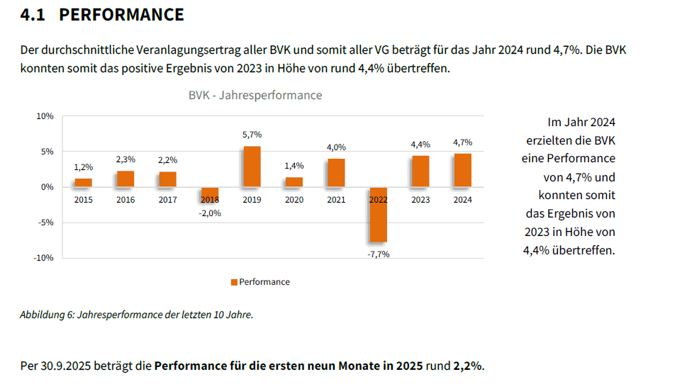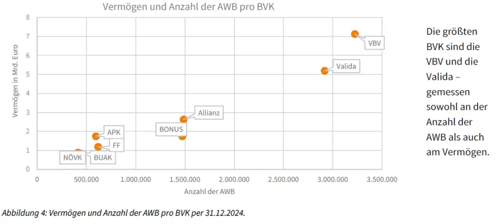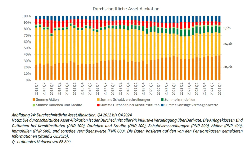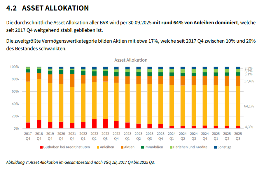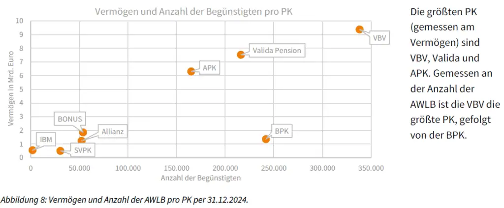 Rund 23 Prozent der Erwerbstätigen in Österreich verfügen über eine betriebliche Altersvorsorge in Form einer Pensionskasse. Zum 30. Juni 2025 zählte dieses System 1.120.386 Begünstigte, davon befanden sich etwa 86 Prozent noch in der Anwartschaftsphase, während rund 14 Prozent bereits eine Pension bezogen. Insgesamt wurden zu diesem Zeitpunkt rund 28,6 Milliarden Euro verwaltet, womit Pensionskassen das größte Volumen innerhalb der betrieblichen Vorsorge darstellen. Die Veranlagung erfolgt kapitalmarktorientiert, wodurch sich Chancen auf höhere Renditen ergeben, gleichzeitig jedoch auch Wertschwankungen möglich sind. Die tatsächliche Leistung hängt daher wesentlich von der Entwicklung der Kapitalmärkte sowie von der Kostenstruktur ab. Besonders verbreitet sind Pensionskassenlösungen in größeren Unternehmen und im Rahmen von Kollektivverträgen. In Österreich bestehen fünf überbetriebliche und drei betriebliche Pensionskassen, wobei drei Einrichtungen rund 80 Prozent des gesamten Vermögens veranlagen. Insgesamt werden 99 Veranlagungs- und Risikogemeinschaften mit 38 Sub-Veranlagungsgemeinschaften verwaltet. Das Rendite- und Risikoprofil wird üblicherweise als mittleres Niveau eingeordnet.