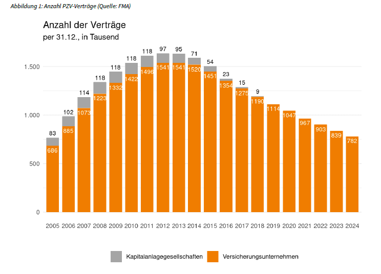 Die Idee grundsätzlich nicht schlecht, doch die Umsetzung war nicht so wie man es sich als Vorsorgender wünschen würde. Das Ergebnis ist, dass es 2012 über 1,6 Millionen solcher Verträge gab, im Jahr 2024 waren es dann nur noch 0,782 Millionen Verträge und es werden weniger und weniger. Grund ist im Regelfall die mangelnde Performance die unterm Strich übrig bleibt.