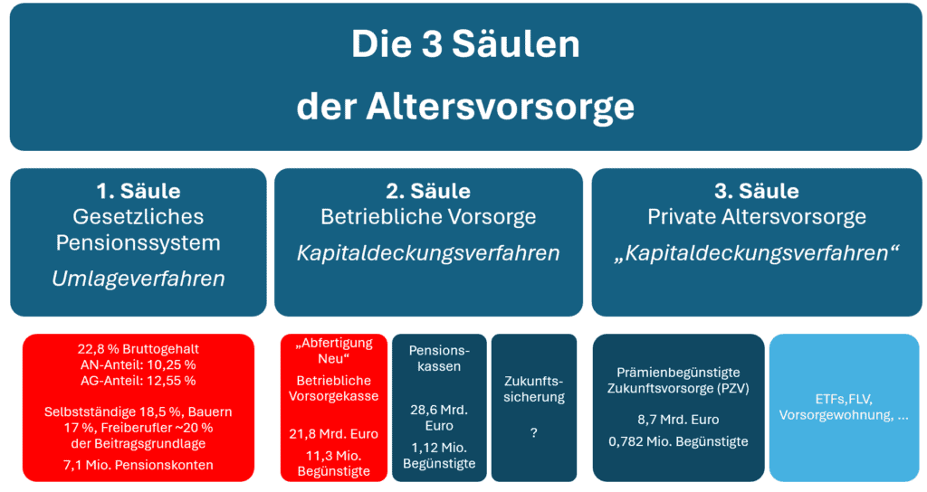 Ziel der Altersvorsorge ist die Absicherung des Lebensstandards im Ruhestand durch mehrere Einkommensquellen. In Österreich besteht weiterhin eine starke Abhängigkeit von der staatlichen Pension, gleichzeitig gewinnt zusätzliche Vorsorge aufgrund des demografischen Wandels zunehmend an Bedeutung. Immer weniger Erwerbstätige finanzieren immer mehr Pensionistinnen und Pensionisten, wodurch das Risiko einer Pensionslücke steigt. Vor diesem Hintergrund wird das österreichische System üblicherweise in drei Säulen gegliedert: gesetzliche Pension, betriebliche Vorsorge und private Altersvorsorge.