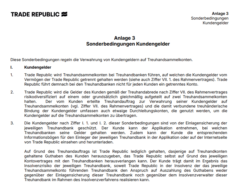 Trade Republic arbeitet mit sogenannten Treuhandbanken zusammen. Kund:innengelder werden nicht auf Einzelkonten, sondern auf Treuhandsammelkonten verwahrt. Das bedeutet: Die Gelder mehrerer Kunden liegen gesammelt auf einem oder zwei Konten bei einer oder mehreren Banken, getrennt vom Vermögen von Trade Republic selbst.