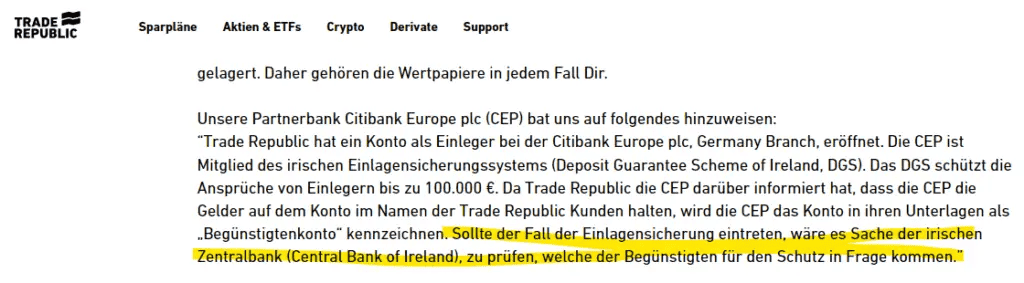 Einzelkonten werden auf den Namen des jeweiligen Kunden geführt und bieten eine klar zuordenbare Einlagensicherung bis 100.000 €. Bei Sammelkonten – wie sie z. B. Trade Republic nutzt – liegt das Kundengeld treuhänderisch auf einem gemeinsamen Konto. Die Absicherung gilt laut BaFin zwar auch hier je Kunde, ist jedoch an Bedingungen wie ein „offenes Treuhandkonto“ geknüpft. Wie das in Frankreich ist oder in Irland, das ist unbekannt. Anfang 2023 hat Trade Republic folgendes Statement auf der Startseite veröffentlicht, die irische Partnerbank HSBC bestand darauf: