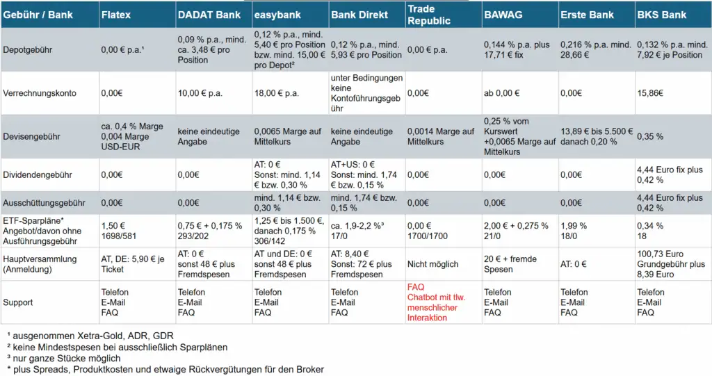 Trade Republic bietet ein ähnliches Modell ohne Gebühren und ist damit der engste Wettbewerber, dafür gibt es dort Nachteile im Bezug auf die fehlerfreien Abrechnungen und die Erreichbarkeit und Qualität des Supports. DADAT Bank ist mit einer geringen Depotgebühr noch halbwegs günstig, wird aber bei vielen Positionen teurer, durch die Mindestgebühr pro Position. Easybank und Bank Direkt haben zusätzliche Kosten für das Depot und bei ausländischen Dividenden, wodurch sie für international diversifizierte Anlegerinnen und Anleger weniger interessant sind. Auch hier gibt es Mindestgebühren bei der Depotgebühr