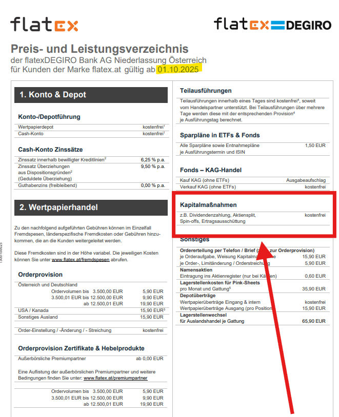 Mit dem neuen Preis- und Leistungsverzeichnis (PLV), das seit 1. Oktober 2025 in Kraft ist, hat Flatex die Dividendengebühr in Österreich gestrichen. Dividendenausschüttungen werden damit für Kundinnen und Kunden ohne zusätzliche Kosten gutgeschrieben.
