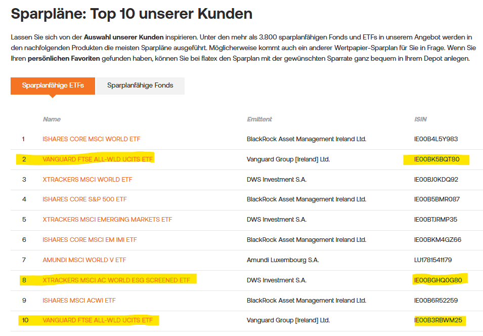 3 der Top 10 ETFs aus den Sparplänen als 0 € Ordergebühr Kauf möglich