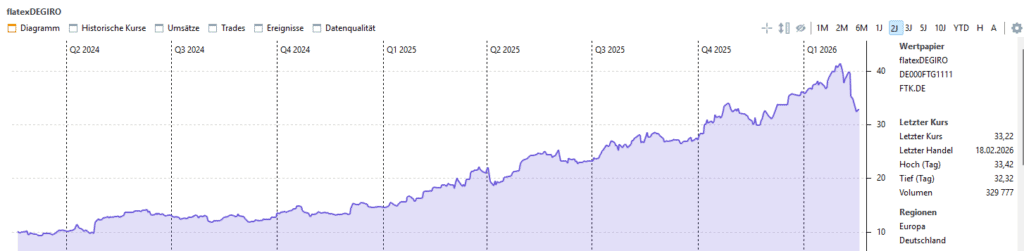 Die Aktie von flatexDEGIRO zeigte in den vergangenen Quartalen insgesamt einen klaren Aufwärtstrend, insbesondere seit Mitte 2024. Im Verlauf des Jahres 2025 beschleunigte sich die Kursentwicklung weiter und führte zeitweise zu Notierungen deutlich über der Marke von 40 Euro.