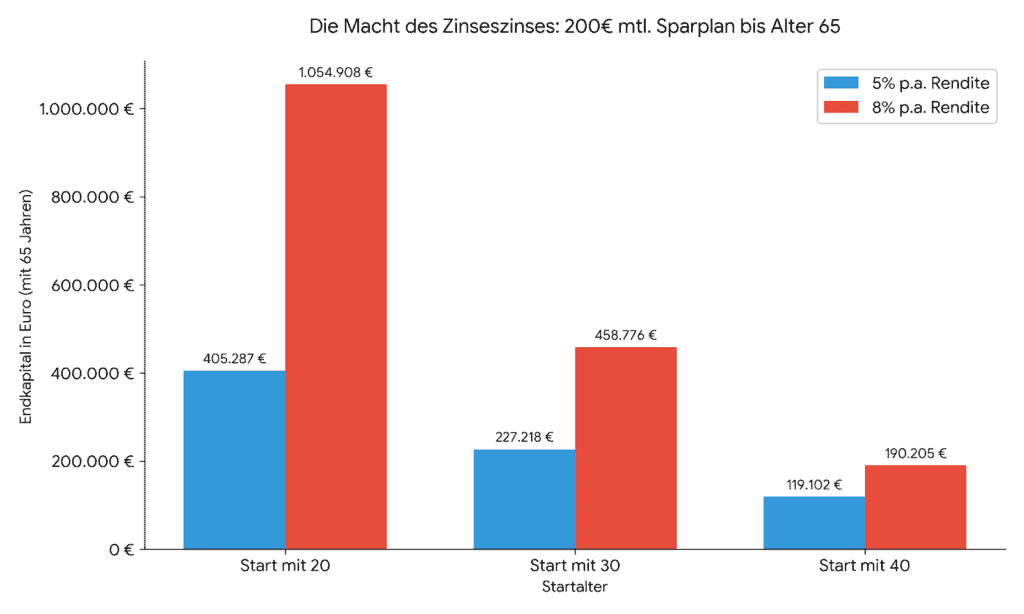 - Zinsertrag vs. Einzahlung: Beim Start mit 20 Jahren und 8 % Rendite stammen nur 108.000 € aus eigenen Einzahlungen, während über 946.000 € rein durch Zinsen entstanden sind.