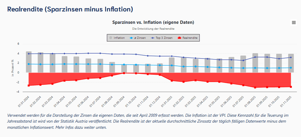 - Sparzinsen rückläufig, Inflation in Österreich weiterhin hoch, deutlich über 3 % im Jahresschnitt, zuletzt wieder bei 4 %. Das ergibt eine negative Realrendite. Das Ersparte verliert so an Kaufkraft.