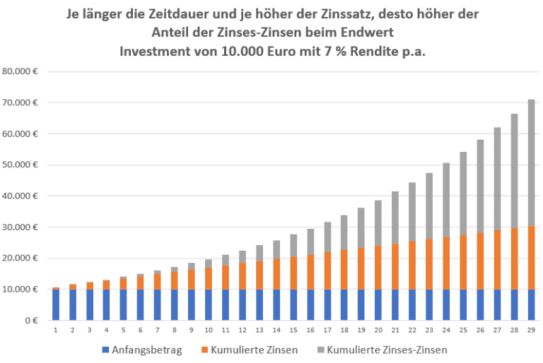 Langfristiges Investieren profitiert vom Zinseszinseffekt. Er entfaltet seine volle Wirkung erst über viele Jahre. Kurzfristige Schwankungen verlieren mit zunehmendem Anlagehorizont an Bedeutung.