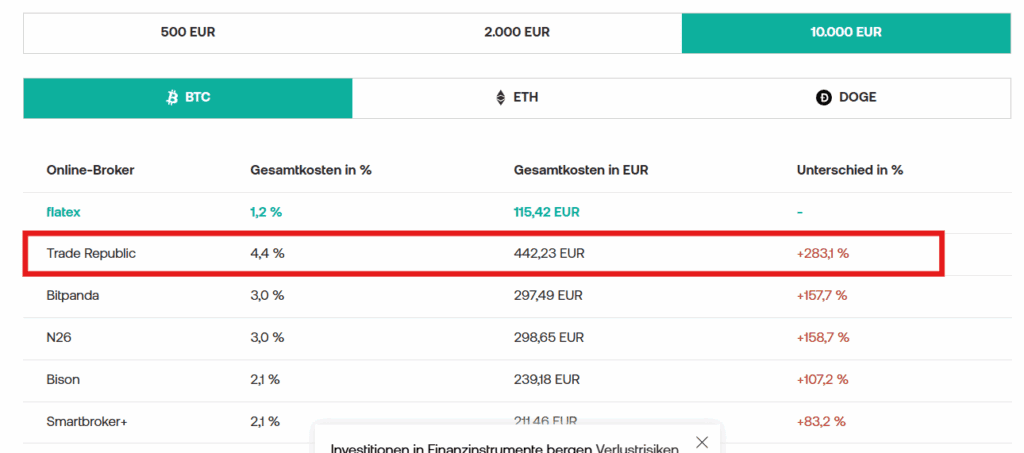 Auf der Website von flatex.de werden Gesamtkosten für Kauf und späteren Verkauf bei einem Gegenwert von 10.000 Euro Gesamtkosten in der Höhe von 4,4 % aufgezeigt: