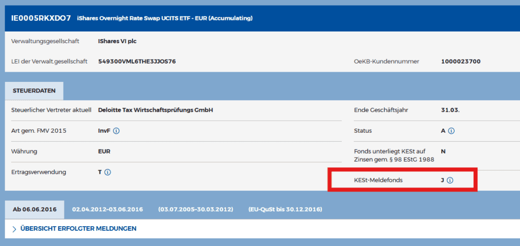 Für österreichische Investorinnen und Investoren ist bei Fonds und ETFs zentral, ob ein Produkt als Meldefonds bei der OeKB geführt wird, da sonst die pauschale Besteuerung als Nicht Meldefonds droht. Die maßgebliche Quelle ist my.oekb.at bzw. die OeKB Informationen zu KESt Meldefonds und Steuerdaten. Hier zeigt sich, dass dieser neue Fonds bei der OeKB bereits als Meldefonds registriert ist, was gut ist!