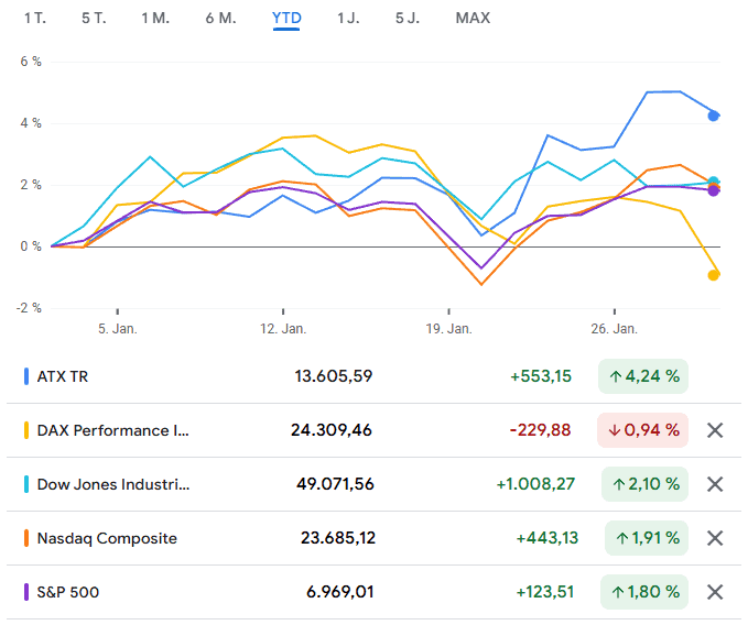 Hier der Stand mit 30. Jänner 2026 um 7:13 Uhr. Der ATX TR mit einem Monatsplus von über 4,2 %, der Dow Jones Industrial Index mit 2,1 % im Plus. Insgesamt zeigten alle Indizes ein schönes Plus im ersten Monat des Jahres 2026 mit der Ausnahme des DAX Performance Index. Dieser ist mit rund einem Prozent im Minus.