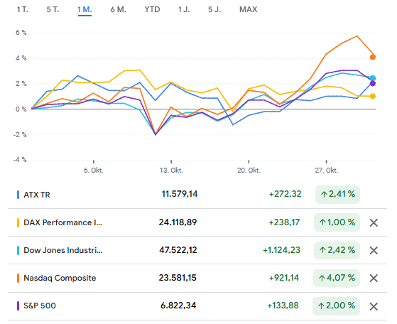 Hier der Stand mit 31. Oktober 2025 um 8:00 Uhr früh. Im Monat Oktober ging es im Monatsverlauf bei allen Indizes wieder hinauf. Hochwetterlage an den Börsen. Der ATX TR kletterte um 2,4 % nach oben, der DAX Performance Index um 1 % nach oben. Bei den us-amerikanischen Indizes ging es um 2 bis 4 % bislang nach oben. Mit einem Plus von 4 % ging es beim NASDAQ Composite Index nach oben.