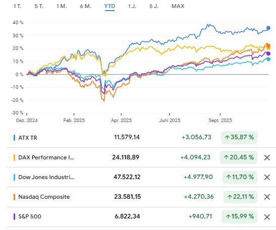 Seit Jahresbeginn war die Börsenentwicklung absolut positiv – zumindest rein kurstechnisch. Gleichzeitig, wir erinnern uns, das erste Quartal 2025 war geprägt von Kursrückgängen die sich mittlerweile deutlich erhohlt haben und die Indizes deutlich im Plus sind. Es scheint kein Halten zu geben. Die Börsen laufen nach oben, laufen sie sich heiß? Die Zukunft wird es zeigen! In Europa lief alles hervorragend, wie es der ATX TR mit einem Plus von fast 36 % zeigt. Auch der DAX Performance Index zeigt über 20 % Plus. In den USA gibt es über die Indizes nun auch satte Plus. Dow Jones plus 11 %, NASDAQ Composite mit +22 % und S&P 500 mit einem Plus von fast 16 %.