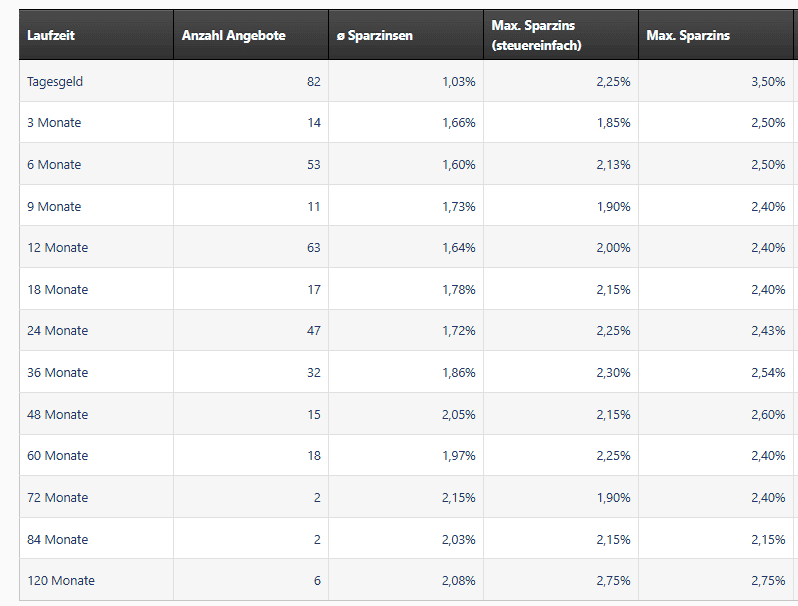 Weiter bleibt der Trend erhalten, dass die Sparzinsen absinken. Seit dem Jahreswechsel auf 2024 geht es von Monat zu Monat bergab, mittlerweile auch sehr gut ersichtlich an den kürzeren Laufzeiten wie z. B. täglich fällig oder eine Bindung über 12 Monate. Da helfen auch die Aktionszinsen nichts, die es bei manchen Anbietern für wenige Monate gibt. Insgesamt zeigt sich in den letzten Monaten, dass die Zinskurve im Moment stabiler wird.