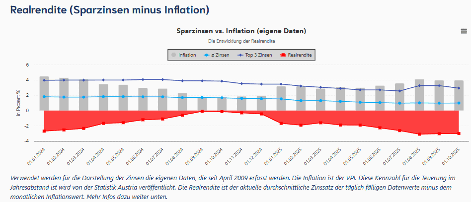 Die EZB-Leitzinsen sinken weiter und die Inflation war laut Schnellschätzung der Statistik Austria im September bei 4,0 %. Die Realrendite, auf der unteren Grafik als roter Bereich eingezeichnet, ist weiterhin negativ. Sie näherte sich der Nulllinie, zuletzt entfernte sie sich jedoch wieder, weil die Sparzinsen nun fallen. Steuern sind bei der unteren Darstellung nicht berücksichtigt.