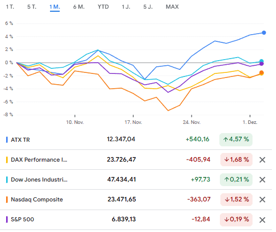 Hier der Stand mit 2. Dezember 2025. Der ATX TR mit einem Monatsplus von über 4,5 %, der Dow Jones Industrial Index knapp im Plus. Alle anderen Indizes im Minus. Der S&P 500 Index nur knapp im Minus, der DAX Performance Index als auch der NASDAQ Composite Index klar im Minus mit über -1,5 %.