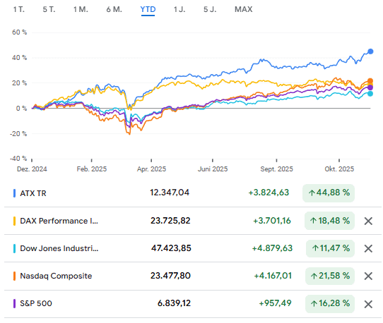 Seit Jahresbeginn war die Börsenentwicklung absolut positiv – zumindest rein kurstechnisch. Gleichzeitig, wir erinnern uns, das erste Quartal 2025 war geprägt von Kursrückgängen die sich mittlerweile deutlich erhohlt haben und die Indizes deutlich im Plus sind. Es scheint kein Halten zu geben. Die Börsen laufen nach oben, laufen sie sich heiß? Die Zukunft wird es zeigen! In Europa lief alles hervorragend, wie es der ATX TR mit einem Plus von fast 36 % zeigt. Auch der DAX Performance Index zeigt über 20 % Plus. In den USA gibt es über die Indizes nun auch satte Plus. Dow Jones plus 11 %, NASDAQ Composite mit +22 % und S&P 500 mit einem Plus von fast 16 %.