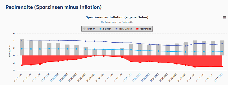 - Ergebnis: negative Realrendite von rund -2,5 Prozent, siehe roter Bereich des nachfolgenden Charts