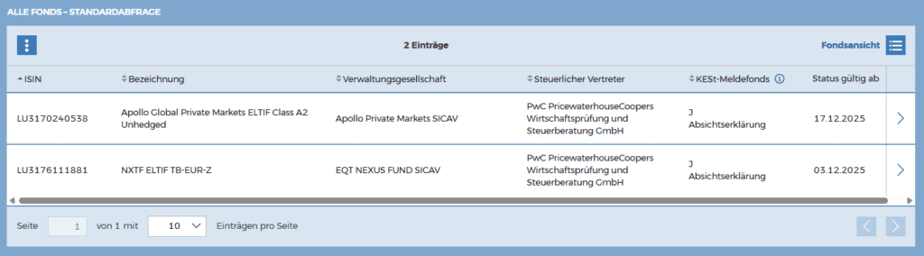 - Apollo Global Private Markets ELTIF Class A2 Unhedged, ISIN LU3170240538, ein langfristig ausgerichteter ELTIF mit breitem Engagement in Private Markets, währungsungesichert und damit mit zusätzlichem Wechselkursrisiko verbunden, steuerlich als KESt-Meldefonds vorgesehen, derzeit auf Basis einer Absichtserklärung, gültig ab 17.12.2025.
