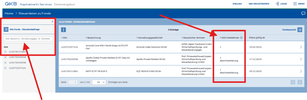 - gibt es keinen Treffer, liegt in der Regel ein Nichtmeldefonds vor (zuvor sollte man aber gewiss sein, dass es sich um einen Fonds nach österreichischen Steuerrecht handelt. Aktien-ISINs z. B. werden dort natürlich auch nicht gefunden)