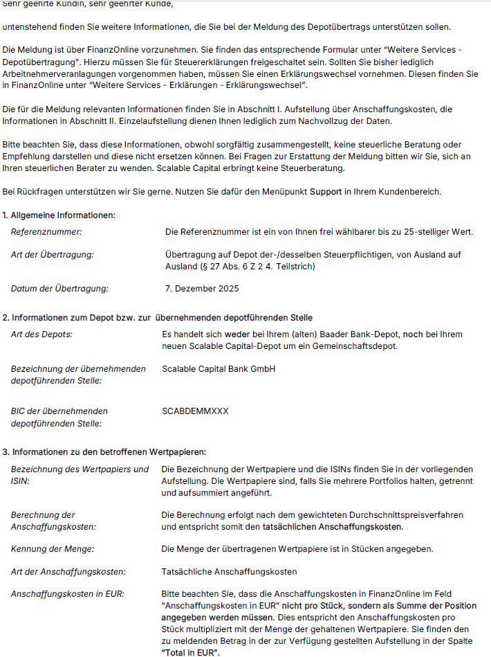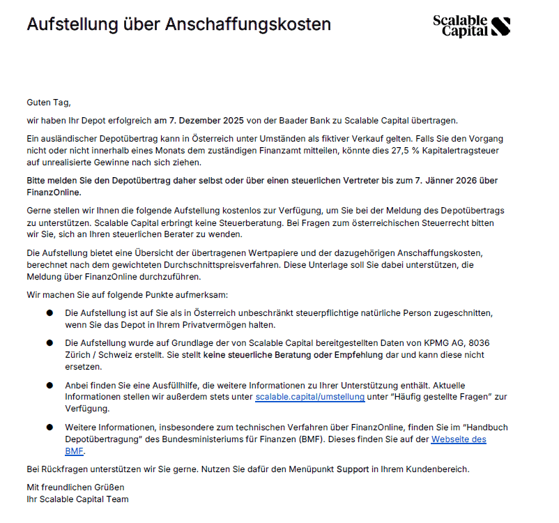 Der Depotübertrag von der Baader Bank auf das neue Scalable Depot ist bereits erfolgt und für österreichische Kundinnen und Kunden steuerlich relevant. Da die Meldefrist bereits läuft sollte die Meldung an das Finanzamt rasch abgefschlossen werden, am besten werden die Feiertage rund um Weihnachten genützt.