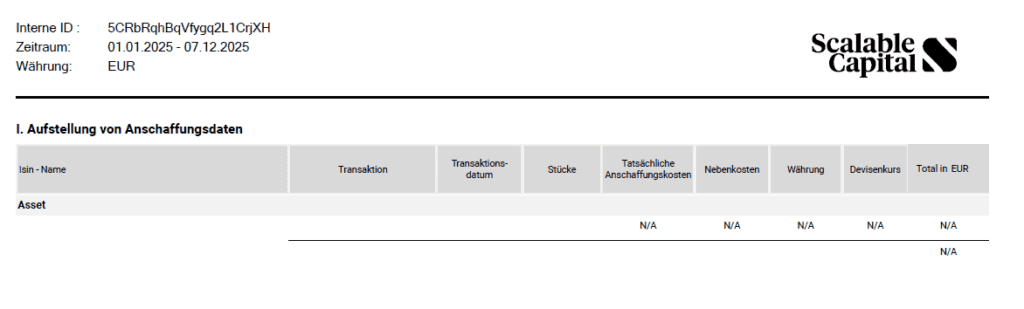 Zur Unterstützung stellt Scalable Capital den betroffenen Kundinnen und Kunden einen Anschaffungsdaten-Report zur Verfügung, der von KPMG erstellt wurde. Dieser Report ist seit dem 18. Dezember 2025 in der Mailbox der App abrufbar. Er enthält eine Übersicht aller übertragenen Wertpapiere sowie deren steuerlich relevante Anschaffungskosten, berechnet nach dem gewichteten Durchschnittspreisverfahren. 20251218 Steuerreport Scalable …