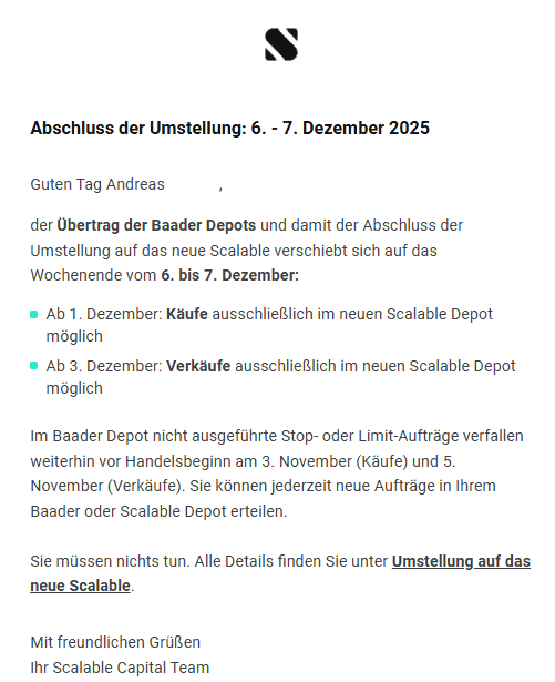 Scalable Capital informiert über eine Verschiebung der Depot-Umstellung: Der finale Übertrag der bisherigen Baader-Depots auf das neue Scalable-System findet nun am Wochenende vom 6. bis 7. Dezember 2025 statt – und damit rund einen Monat später als ursprünglich geplant.