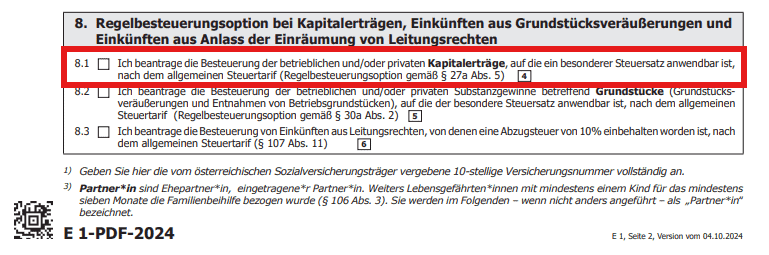 Im Formular E1 der Einkommensteuererklärung muss angekreuzt werden, dass die Regelbesteuerungsoption gezogen werden möchte. Standardmäßig ist hier kein Hakerl zu finden. Mit dem Setzen des Hakerls werden alle Kapitalerträge regelbesteuert anstatt mit dem besonderen Steuersätze von 25 % bzw. 27,5 %