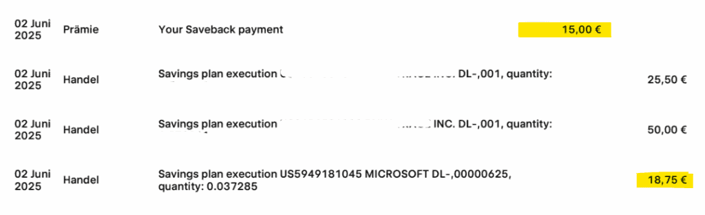 Im Juni 2025 wurde das nächste Saveback-Guthaben besteuert – und erneut zeigt sich eine Änderung: Beim Zufluss wird nun der besondere Steuersatz von 25,0 % angewendet. Problematisch bleibt weiterhin, dass nach dem Abzug der Kapitalertragsteuer vom Cashkonto-Guthaben erneut der Bruttobetrag „hergestellt“ wird, um diesen dann zu investieren. Die Steuer wird an das Finanzamt abgeführt und gleichzeitig nimmt Trade Republic vom Cashkonto den selben Betrag um wieder auf den ursprünglichen Saveback Betrag zu kommen.