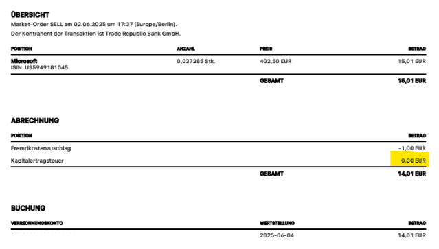 Die Steuer von 25 % auf 15,00 Euro ergibt 3,75 Euro – in der Abrechnung als „Zinssteuer“ bezeichnet. Mit Trade Republic halten also auch neue Steuerbegriffe in Österreich Einzug. Wenn die Kreativabteilung die Abrechnungsbelege erstellt.