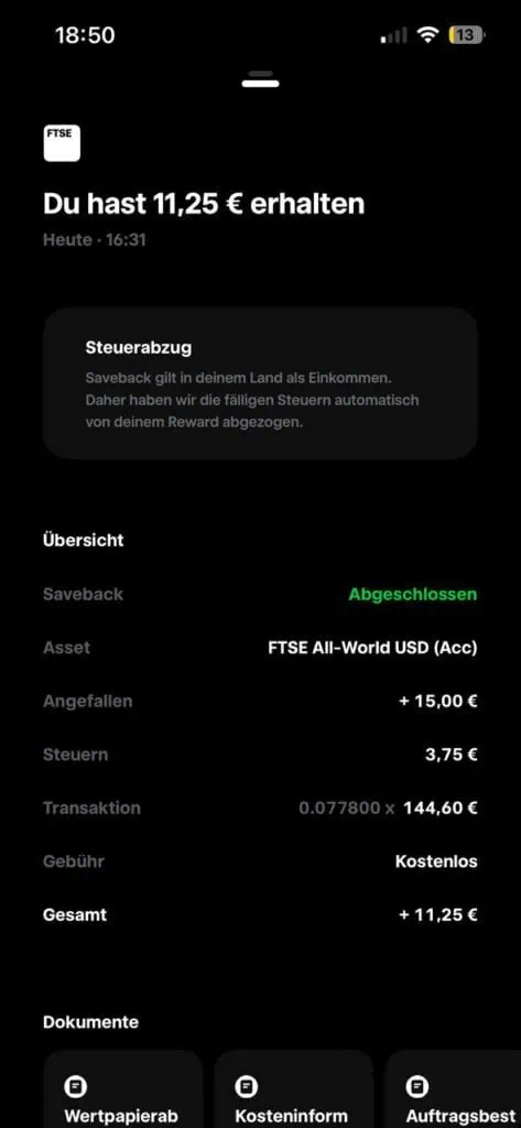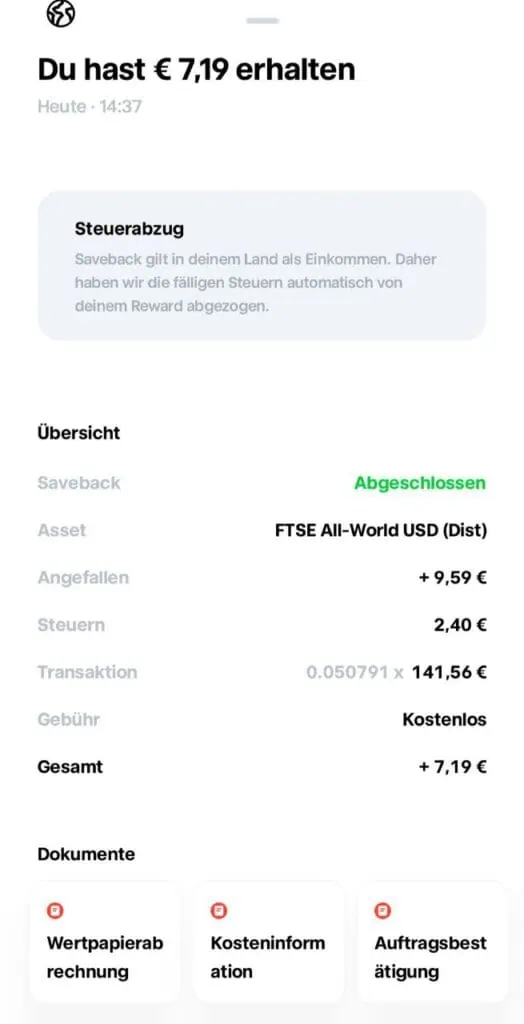 Fällt ein Saveback von 15,00 Euro an, werden daraus 3,75 Euro Kapitalertragsteuer berechnet, sodass 11,25 Euro in das gewählte Saveback-Asset investiert werden. Bei einem geringeren Saveback von 9,59 Euro reduziert sich der investierte Betrag aufgrund der Steuer auf 7,19 Euro.