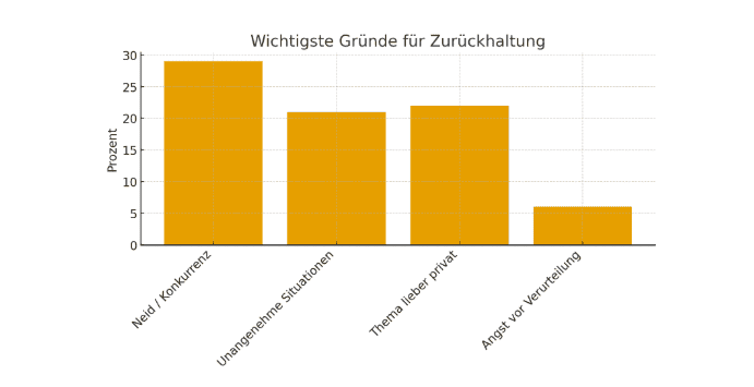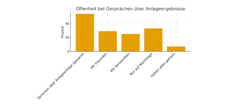 Konkrete Summen oder Anlagestrategien werden noch seltener geteilt. 17 Prozent geben solche Informationen nie preis. Nur 26 Prozent tun dies auf Nachfrage und 22 Prozent lediglich innerhalb der engen Familie. Im Freundeskreis werden Details noch restriktiver gehandhabt. Bemerkenswert ist, dass sich 64 Prozent grundsätzlich wohl fühlen, über ihre Investitionen zu sprechen, 20 Prozent sogar sehr wohl. Ein größeres Vertrauen führt jedoch kaum zu mehr Offenheit.