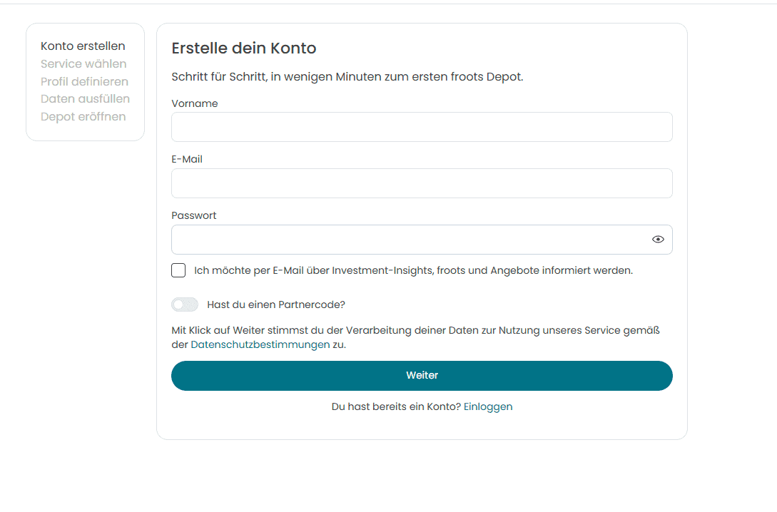 Um bei froots investieren zu können, braucht es ein monatliches Kapital von mindestens 75,00 Euro oder eine Einmalzahlung von 1.500 Euro.