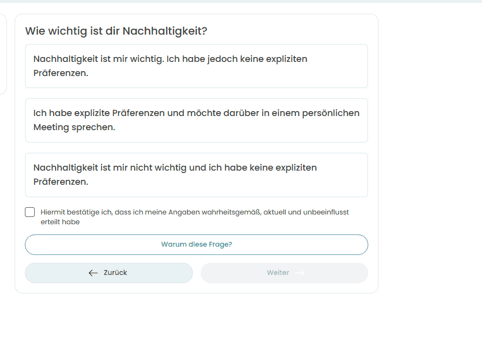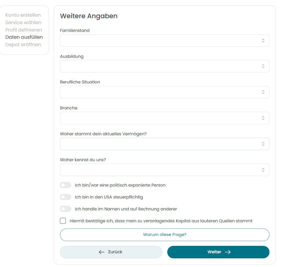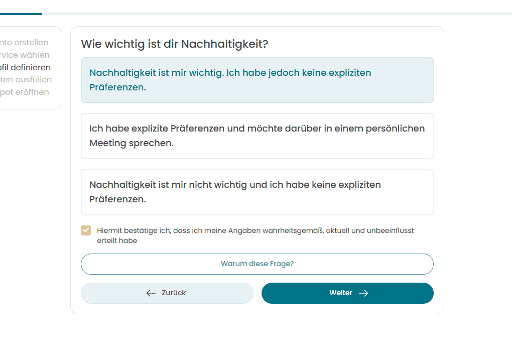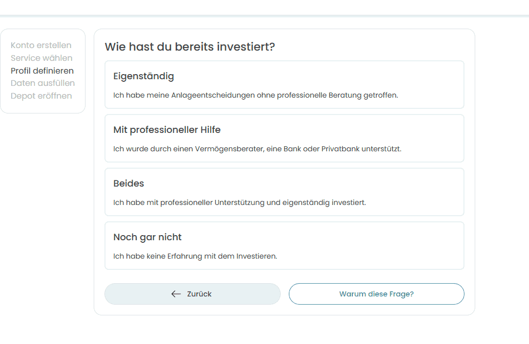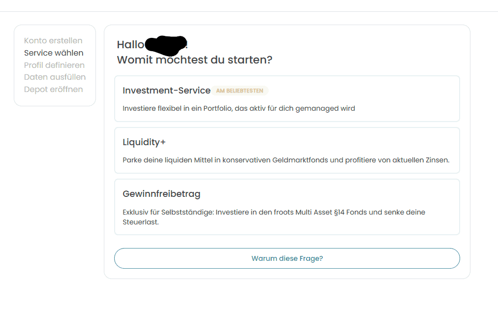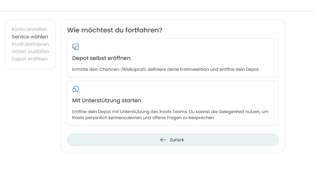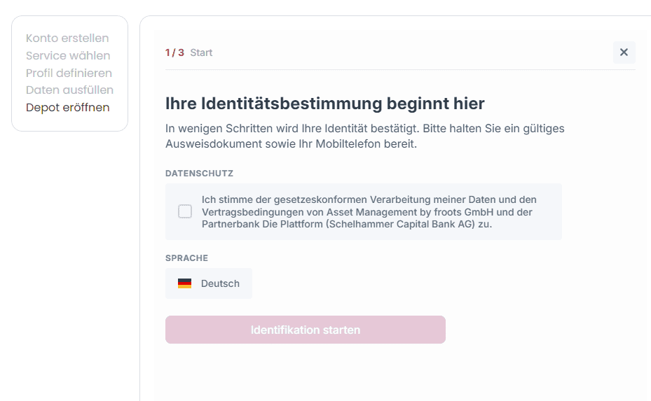 Der Eröffnungsprozess dauert laut froots rund 15 Minuten. Die Definition der Anlageziele ist der erste wichtige Punkt für eine erfolgreiche Eröffnung. Danach kommt es zur Verifizierung der Identität, unter anderem mit der Begründung, „um sicher zu stellen, dass unser Algorithmus der einzige Roboter ist“, froots möchte somit sicher gehen, dass es sich bei den Antragstellern um reale Personen mit Personalausweisen handelt. Ist alles geprüft, braucht nur noch die Sparrate oder Einmalzahlung angegeben werden.