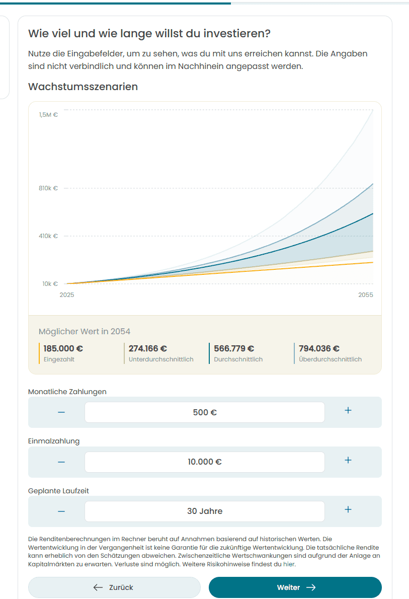 Die verfolgte Strategie von froots ist, dass erst Ziele definiert werden müssen. froots nimmt dabei die Kundinnen und Kunden sanft an die Hand, und errechnet den monatlichen Sparbetrag und die invidiuelle Risikobereitschaft in Hinblick auf den gewünschten Veranlagungszeitraum. Das Portfolio wird im nächsten Schritt individuell zusammengestellt. Das große Versprechen lautet dabei, mit der richtigen Dosis an Risiko eine gute Rendite zu erzielen. Ausgegangen wird von einem mittel- bis längerfristigen Anlagehorizont, so dass der Zinseszins zu tragen kommt und kurzfristige Kursschwankungen ohne Bedeutung sind.