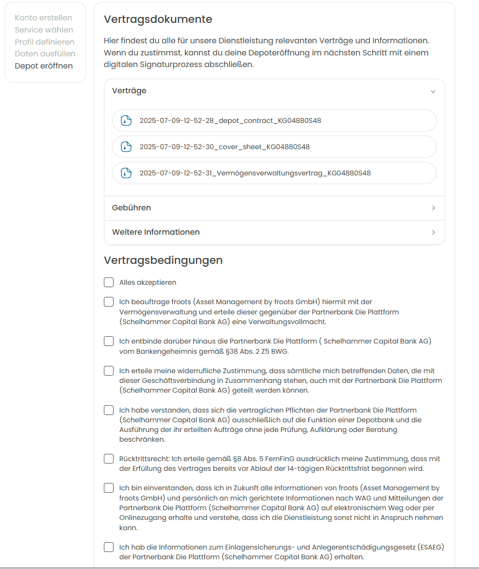Die Partnerbank ist die Schelhammer Capital Bank. Hieraus entstehen keine zusätzlichen Kosten, denn in der Management Fee von Froots sind diese Kosten bereits inkludiert.
