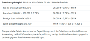 Die Depotgebühr ist je nach Partnerbank unterschiedlich. BAWAG/easybank Kunden bezahlen eine All-In-Gebühr von 0,99 % p.a. Für Kunden der Schelhammer Capital Bank gilt ein gestaffeltes Gebührenmodell: